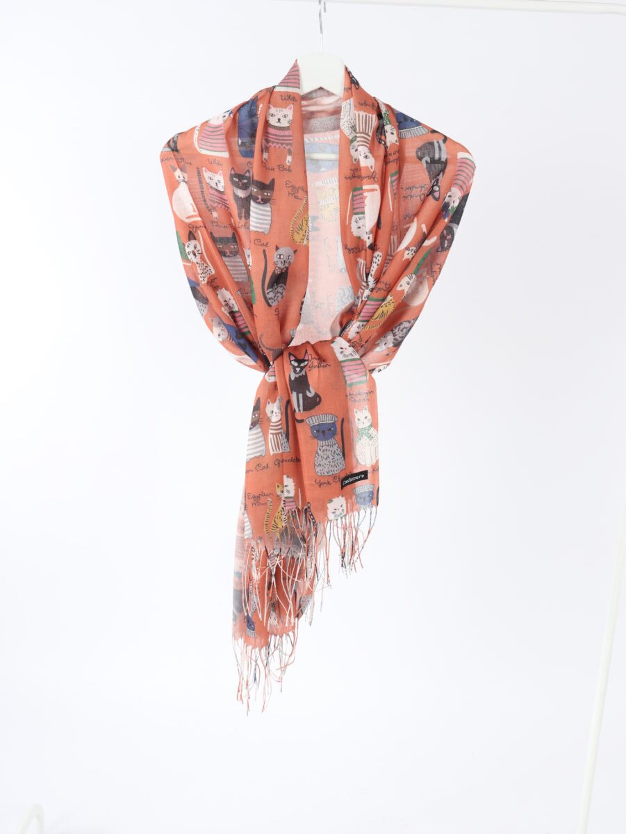 Esarfa din casmir cu print colorat pisicute si ciucuri.