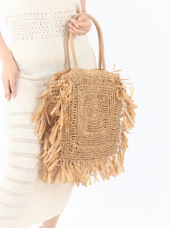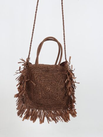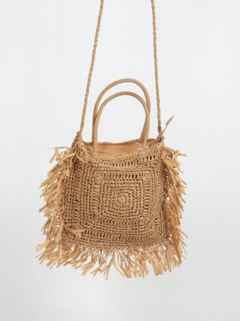 Geanta de plaja din paie cu efect impletit si franjuri.