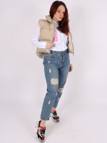 Blugi dama cu efect deteriorat. Modelul prezinta croiala pe corp, buzunare si inchidere prin fermoar si nasturi. Se recomanda spalare la masina la 30 grade, de preferat spalare manuala. ! Nu iese culoarea, materialul nu intra la apa! Materialul este foarte placut la atingere!