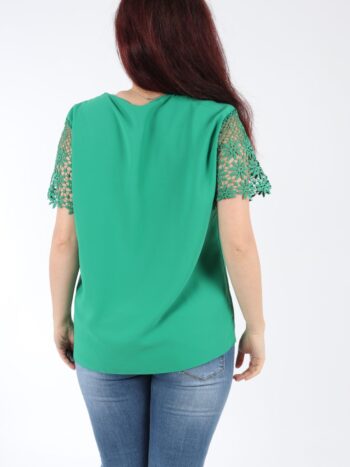 Bluza dama eleganta cu maneci din dantela brodata. Modelul prezinta guler rotund cu accesoriu stralucitor. Croiala este lejera si avantajeaza silueta.