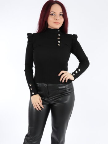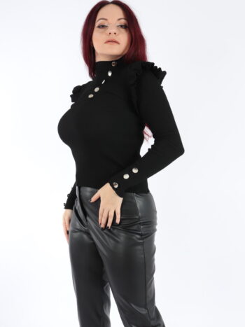 Pulover dama elegant cu volanase si nasturi metalici. Modelul prezinta croiala pe corp, guler inalt si maneca lunga. Materialul este foarte placut la atingere si permite intindere. Se recomanda spalare la masina la 30 grade, de preferat spalare manuala. ! Nu iese culoarea, materialul nu intra la apa!