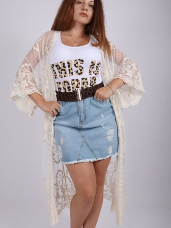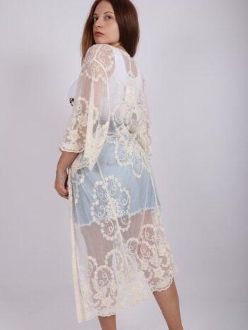 Cardigan dama lung din dantela brodata. Modelul prezinta croiala lejera si siret de inchidere. Materialul contine: 65%bumbac,35%poliester. Se recomanda spalare la masina la 30 grade, de preferat spalare manuala. ! Nu iese culoarea, materialul nu intra la apa! Materialul este foarte placut la atingere si permite intindere!