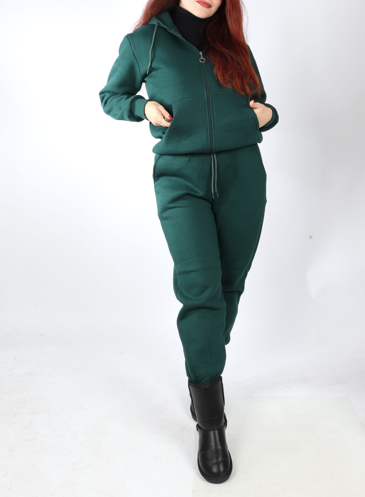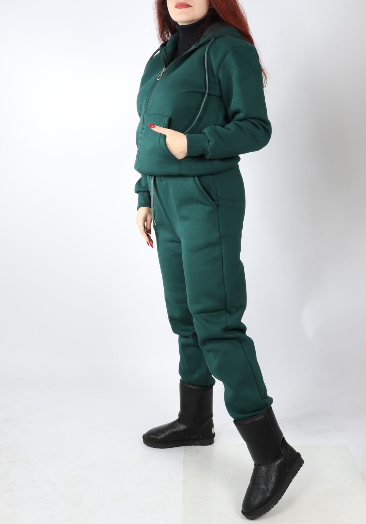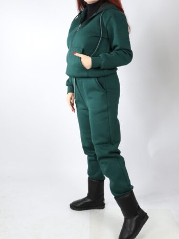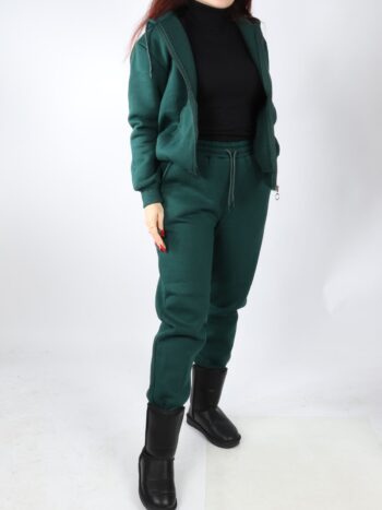 Modelul prezinta bluza cu gluga si buzunare si pantaloni cu elastic in talie.