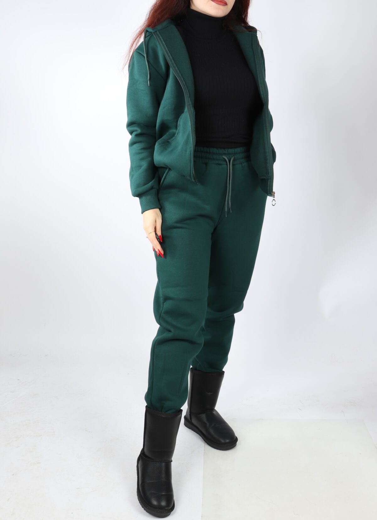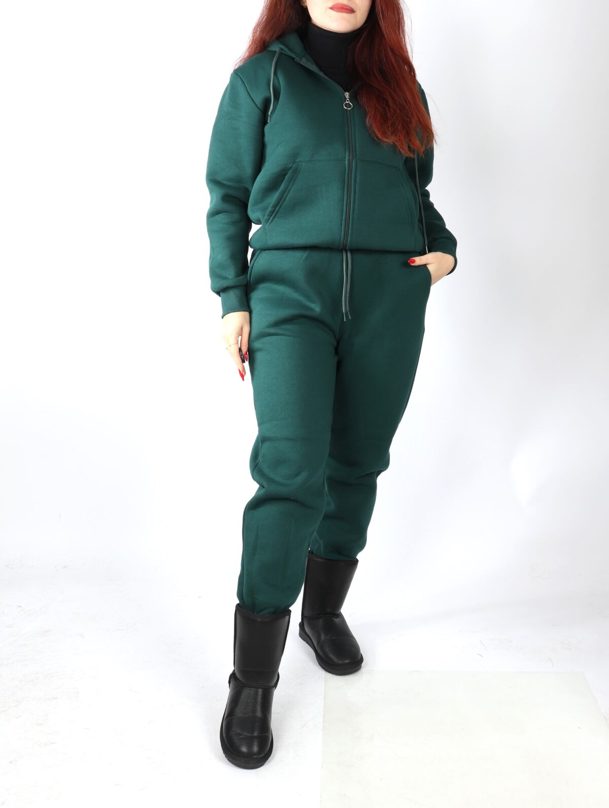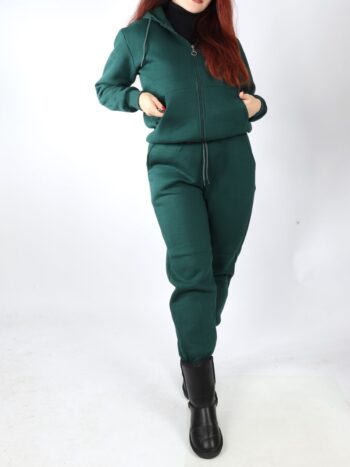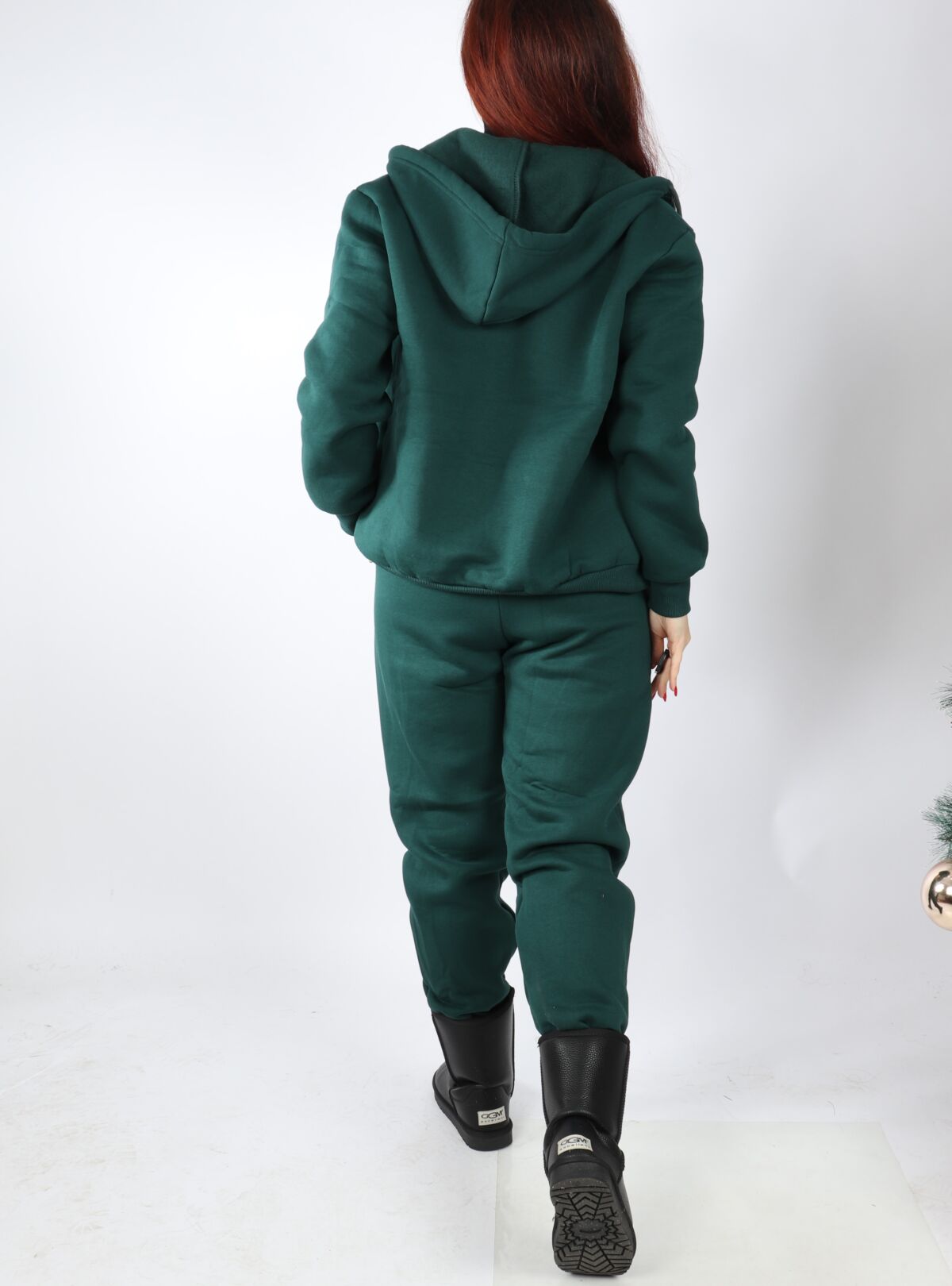Modelul prezinta bluza cu gluga si buzunare si pantaloni cu elastic in talie.