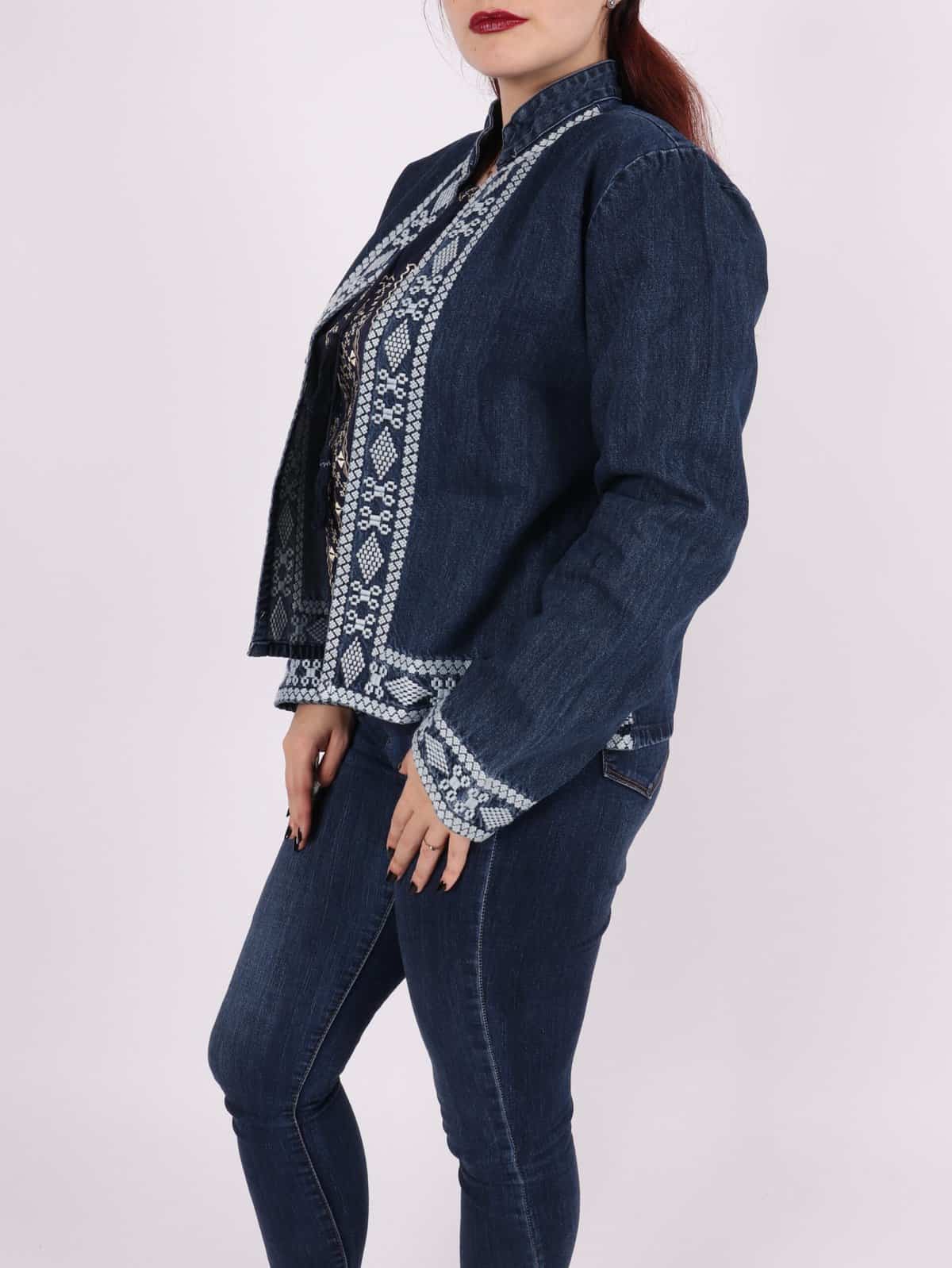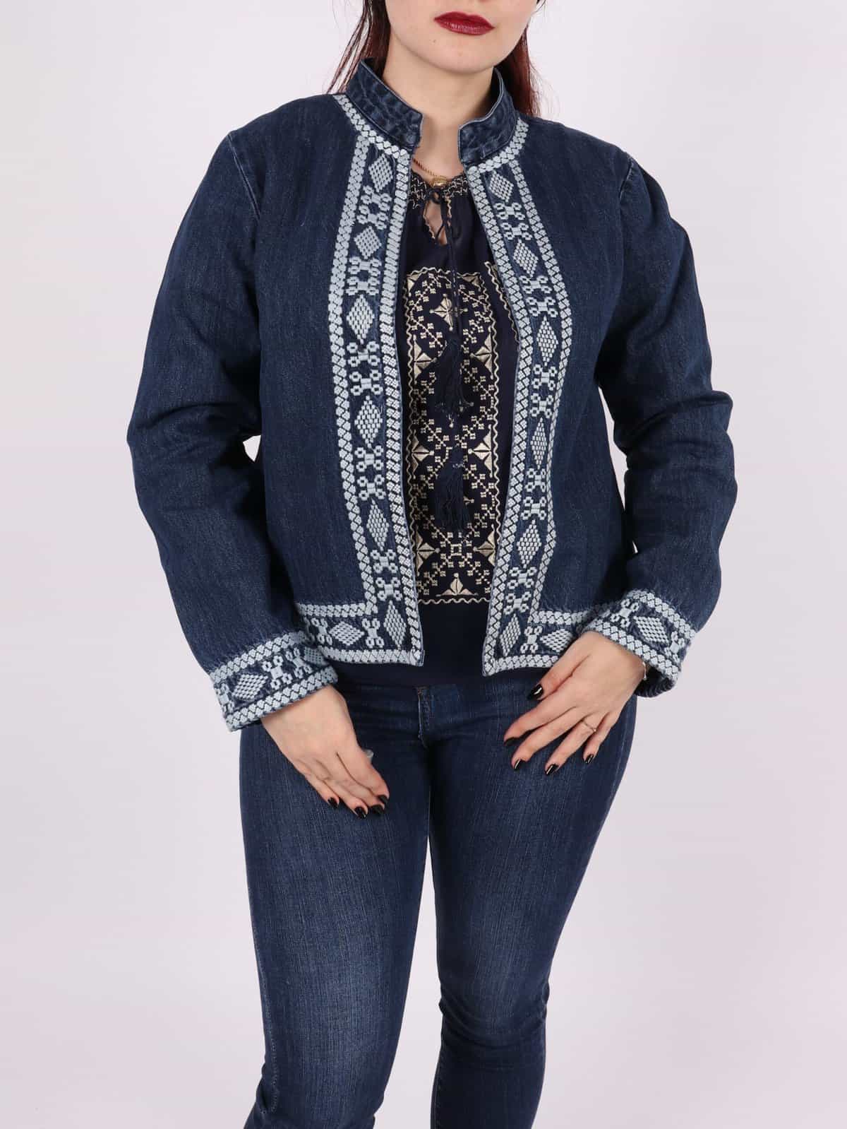 Jacheta dama traditionala cu broderie. Broderie cusuta la masina. Croiala dreapta. Culoare:albastru, maneca lunga. Modelul din imagine are 165 cm, 59 kg, 98 cm in bust si poarta masura S. ! Se recomanda spalare la masina nu mai mult de 30 grade, de preferat spalare manuala. ! Nu iese culoarea din broderie, materialul nu intra la apa! 100%BUMBAC