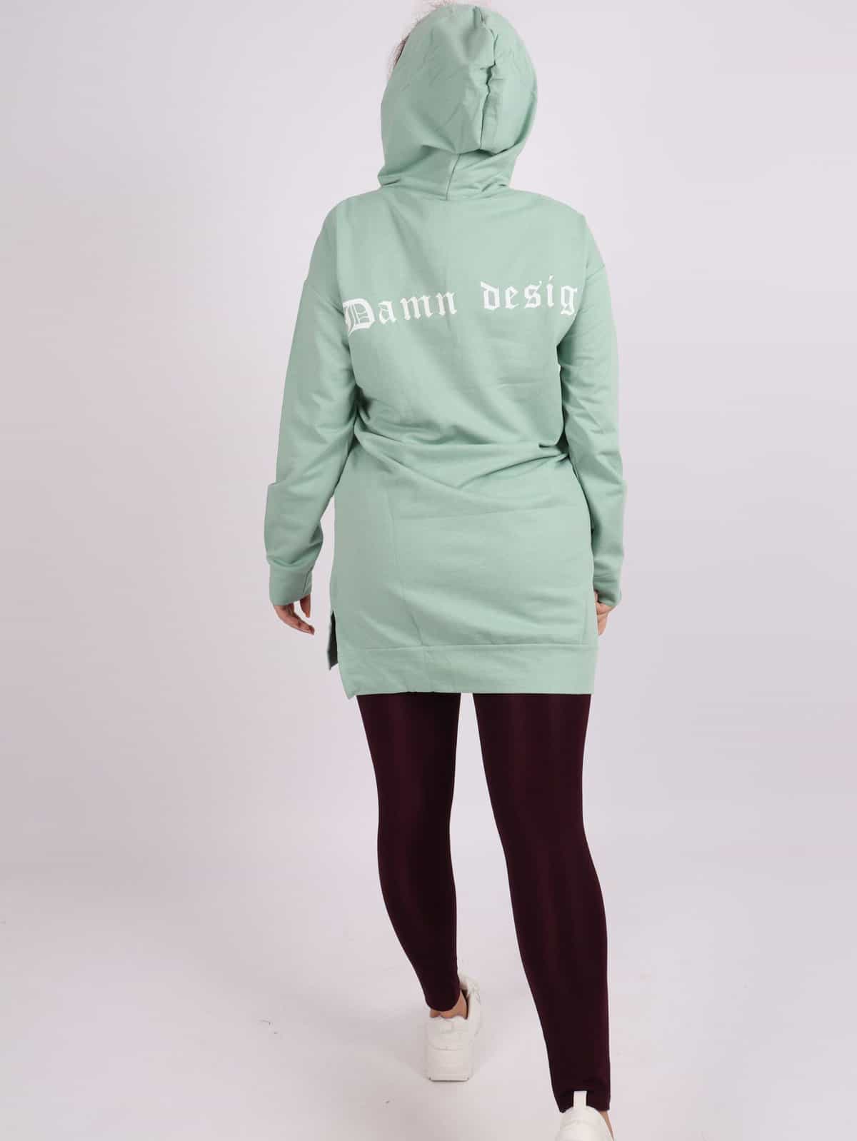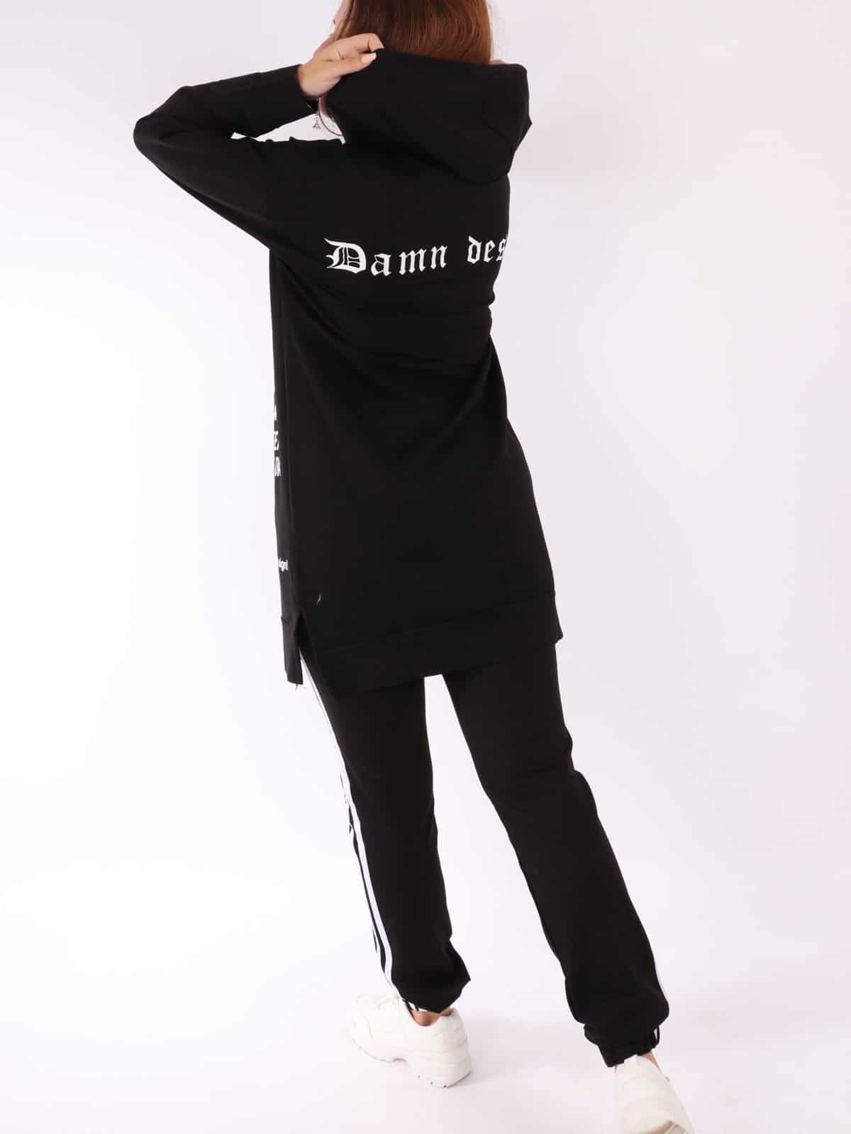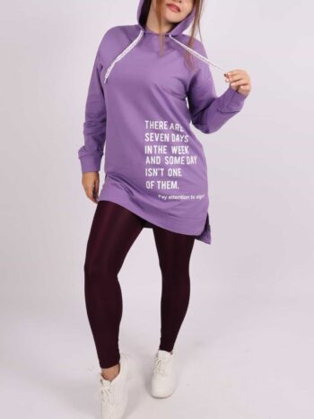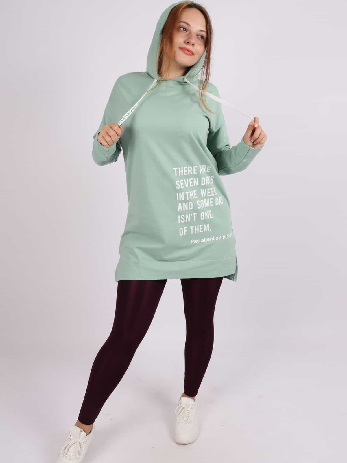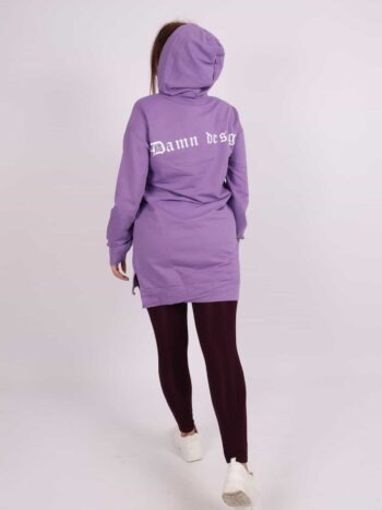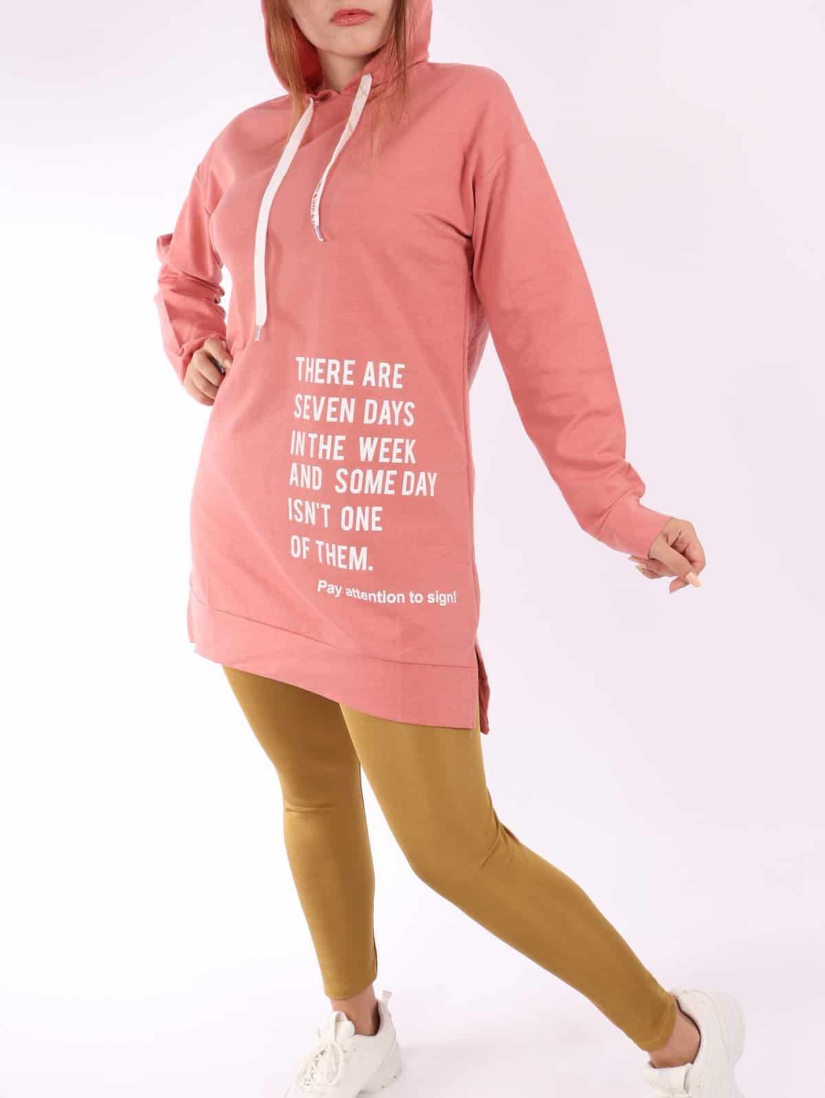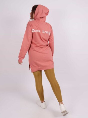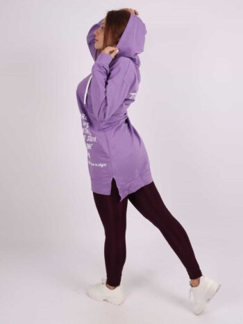 Hanorac dama lung cu print. Modelul prezinta croiala lejera. gluga si print text. Disponibil in diferite culori. Materialul contine:100% Bumbac. Materialul permite intindere si este foarte placut la atingere. Se recomanda spalare la masina la 30 grade, de preferat spalare manuala. ! Nu iese culoarea, materialul nu intra la apa!