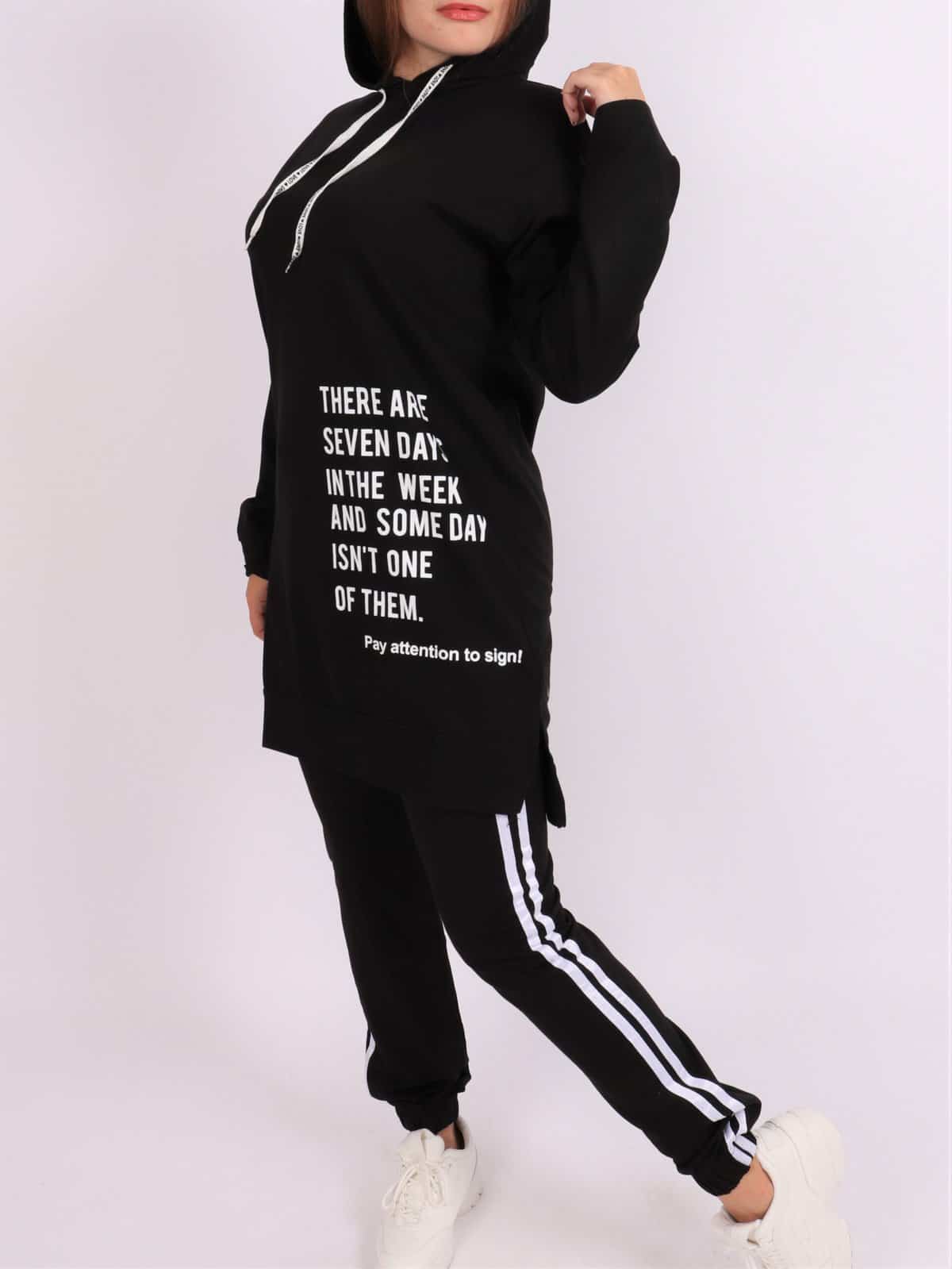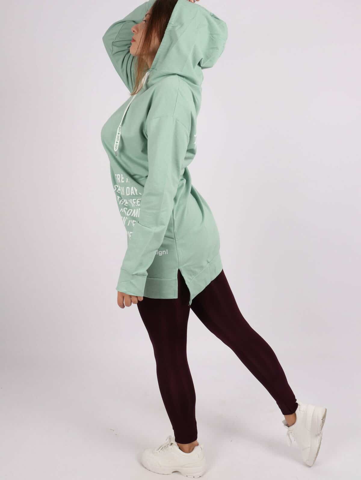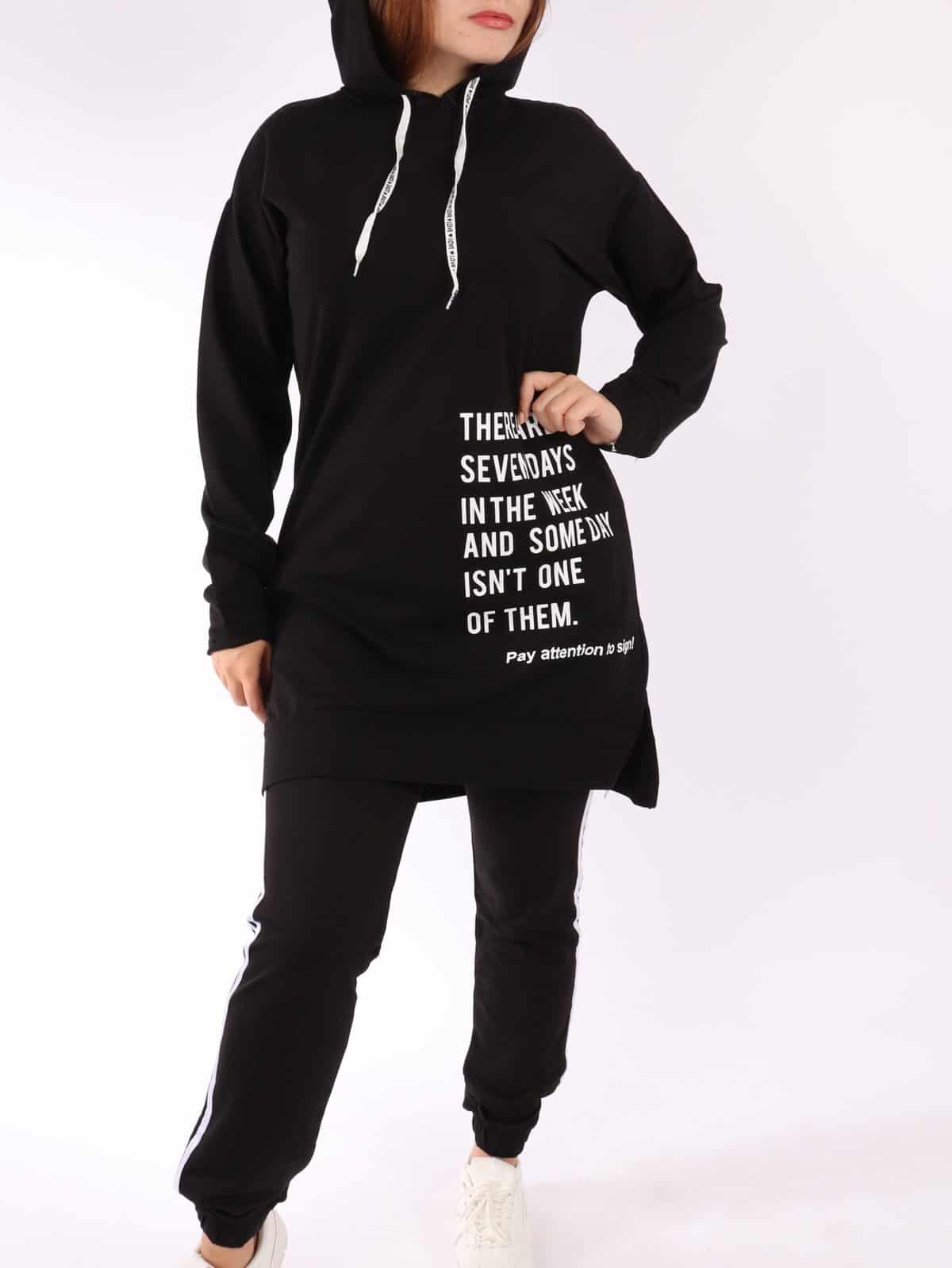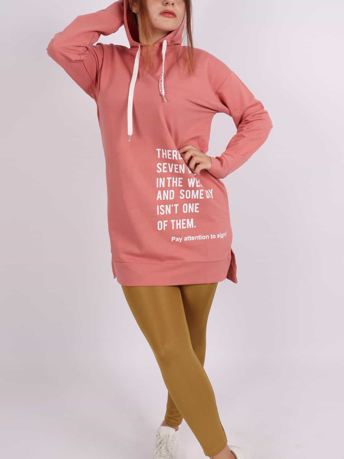 Hanorac dama lung cu print. Modelul prezinta croiala lejera. gluga si print text. Disponibil in diferite culori. Materialul contine:100% Bumbac. Materialul permite intindere si este foarte placut la atingere. Se recomanda spalare la masina la 30 grade, de preferat spalare manuala. ! Nu iese culoarea, materialul nu intra la apa!