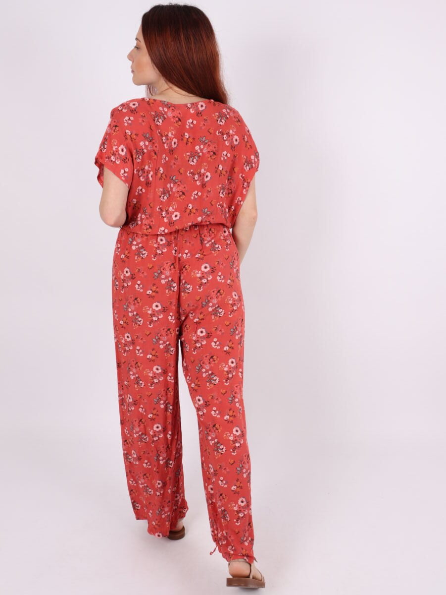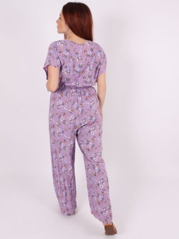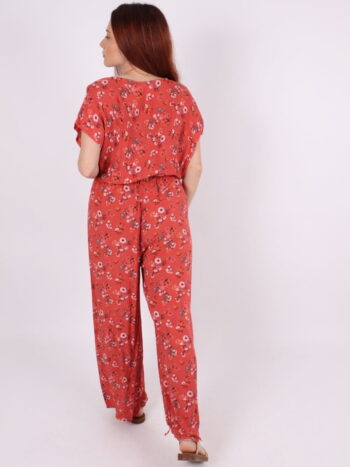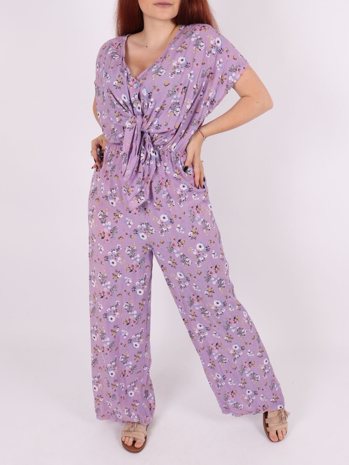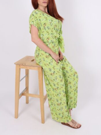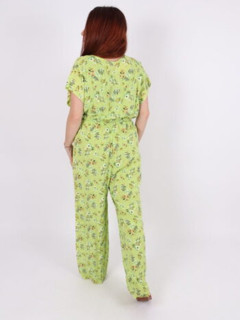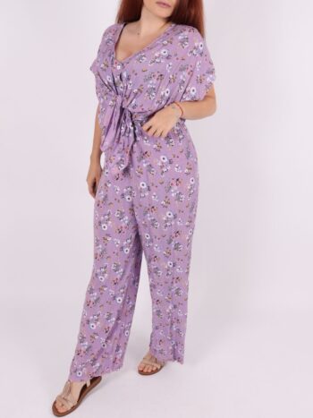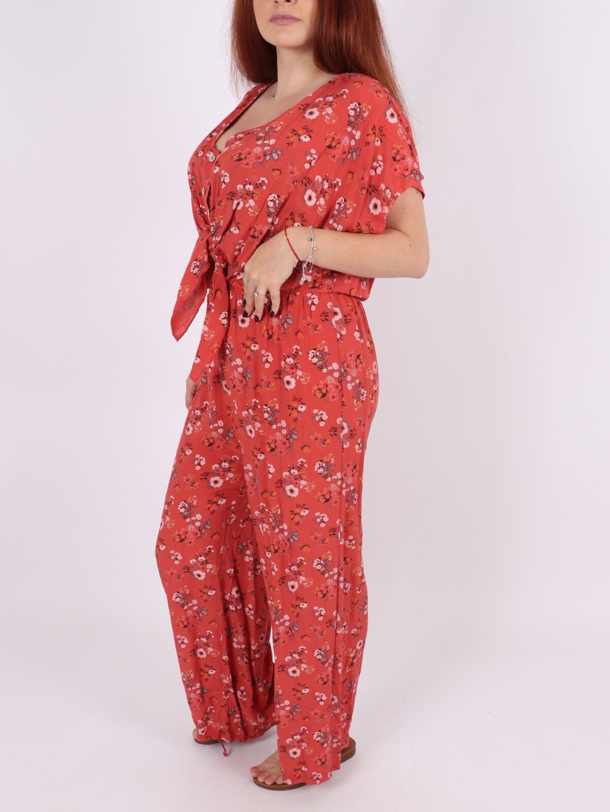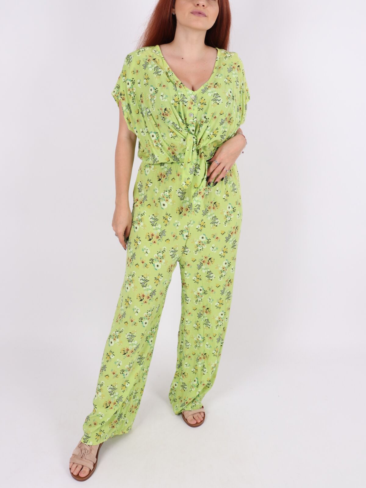 Salopeta de vara, lunga cu print floral. Modelul este prevazut cu elastic in talie, inchidere prin nasturi si funda.