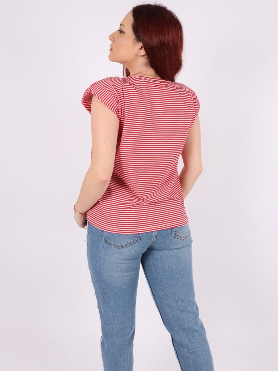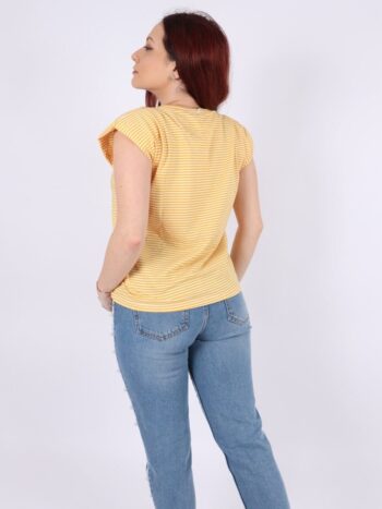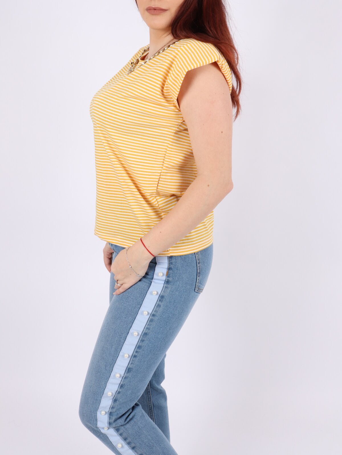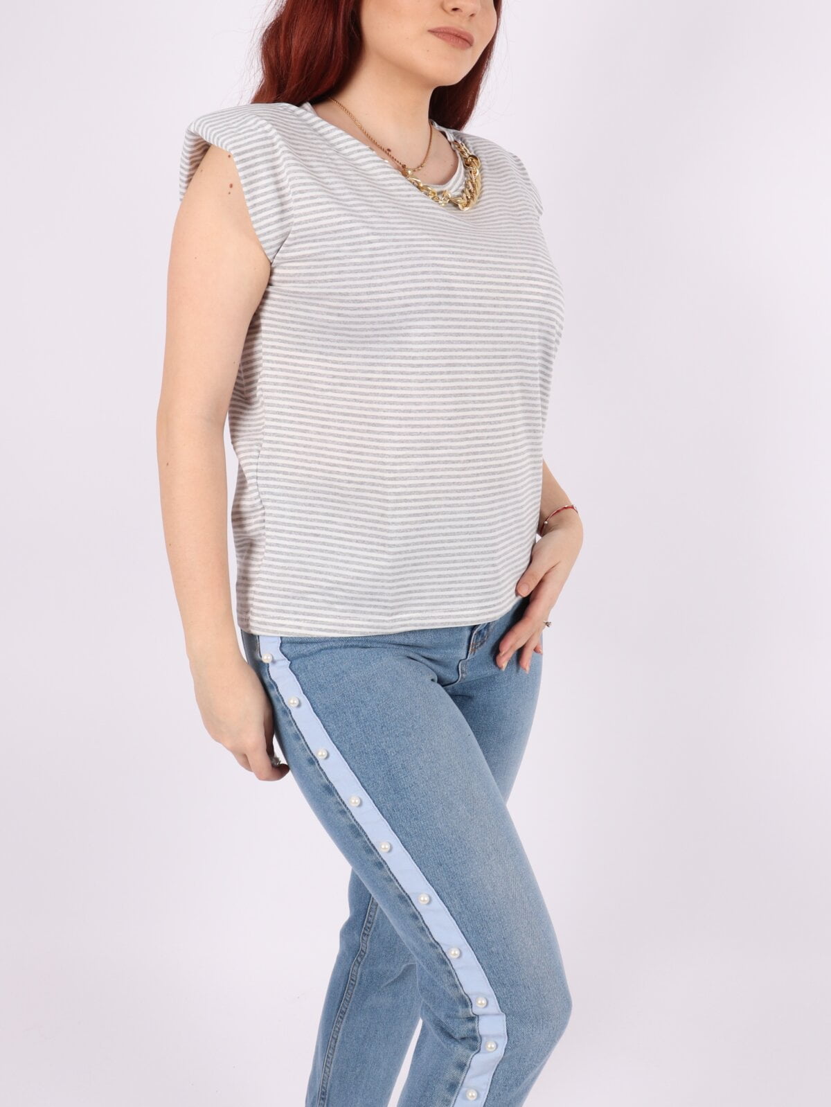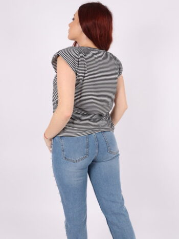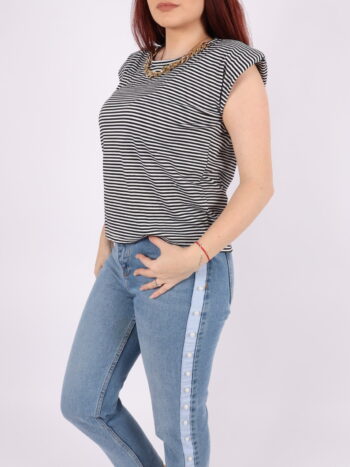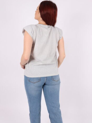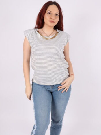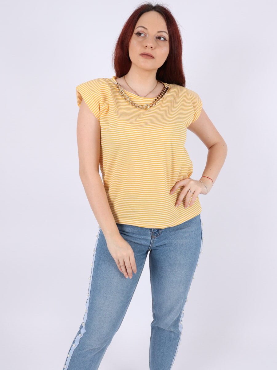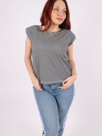 Tricou cu dungi, efect umeri bufanti si lant auriu.