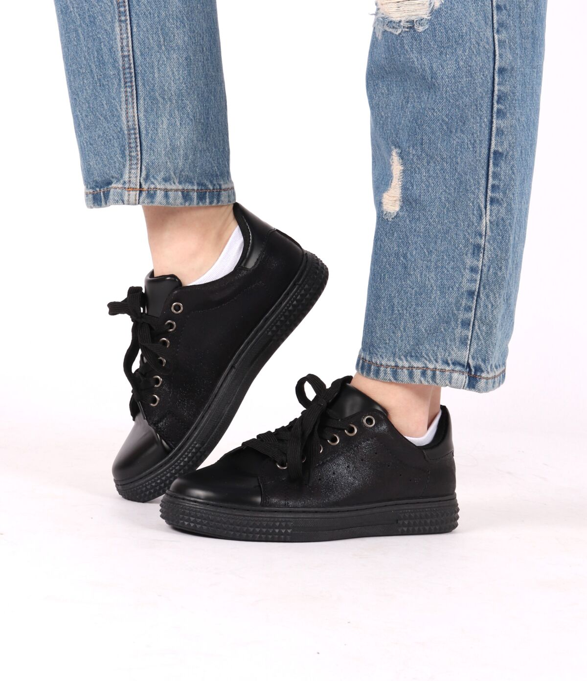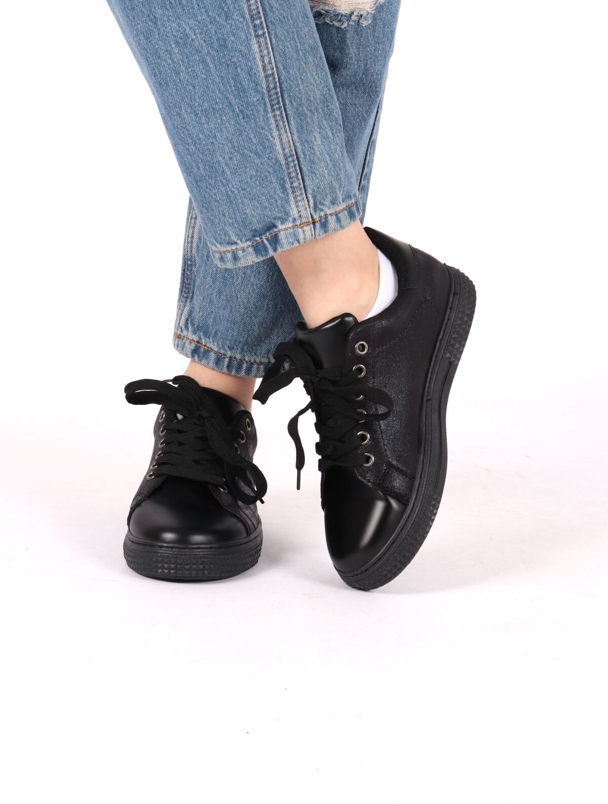 Tenisi cu efect lucios si talpa flexibila.Modelul prezinta inchidere prin siret si efect 3D.