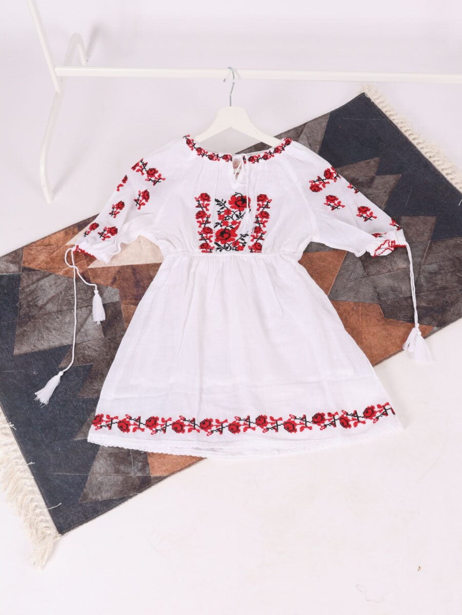 Rochie traditionala fetite cu broderie colorata. Modelul prezinta elastic in talie si dantela brodata.