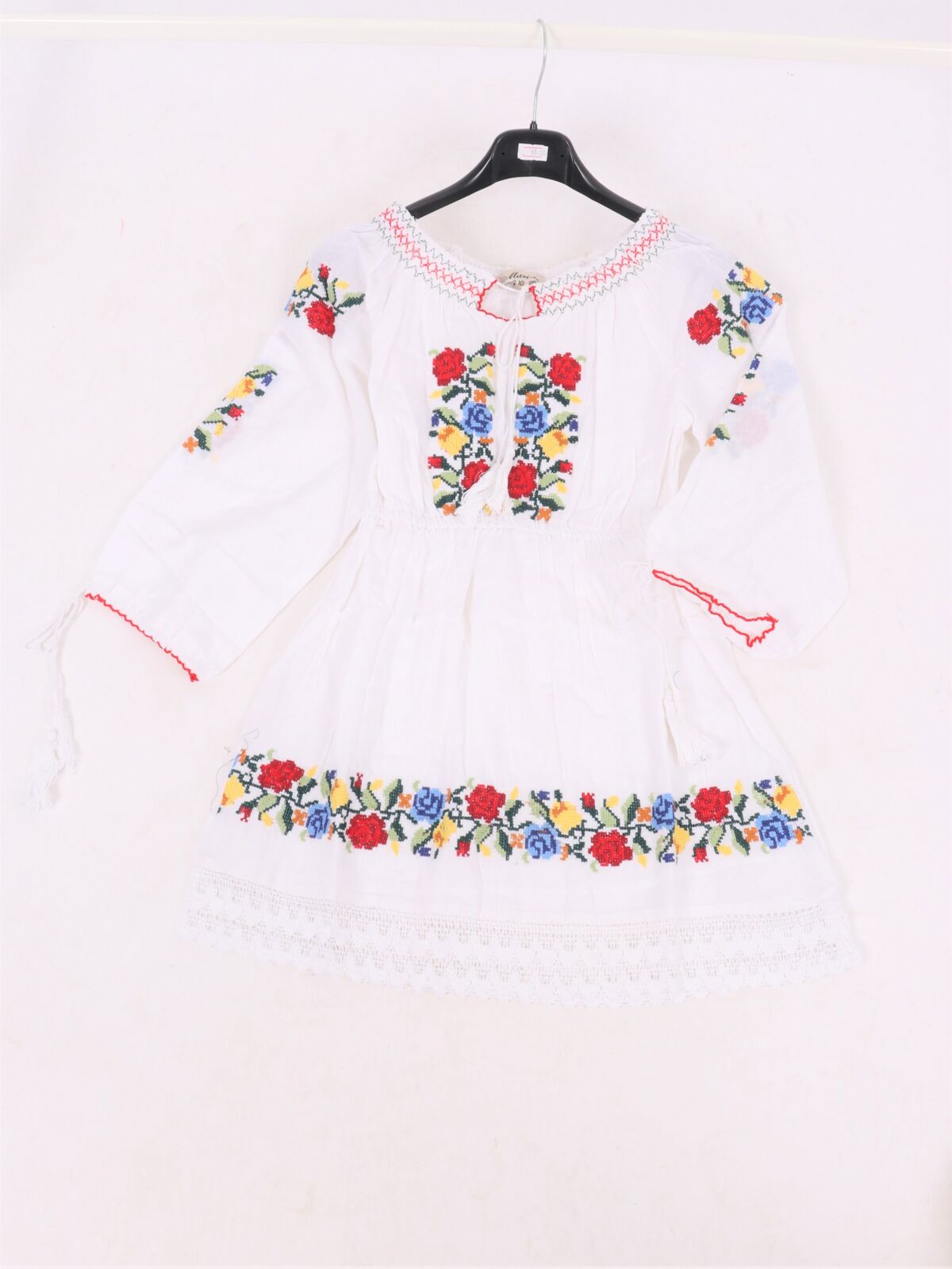 Rochie traditionala fetite cu broderie colorata. Modelul prezinta elastic in talie si dantela brodata. Broderia este cusuta la masina. Materialul este din 100%BUMBAC. Nu intra la apa si nu iese culoarea din broderie. Se recomanda spalare la masina la 30 grade, de preferat spalare manuala. !