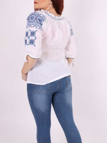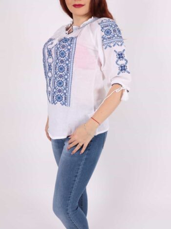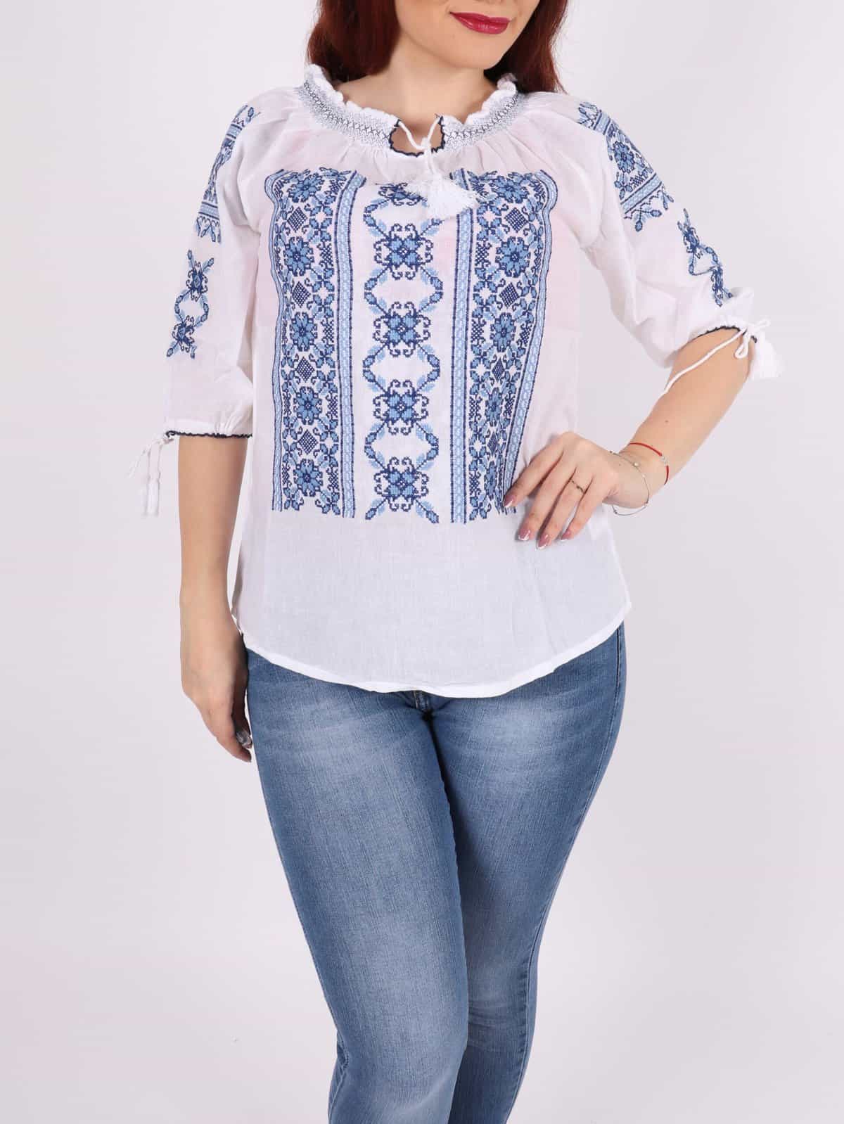 Tabel de măsuriIe din panza de bumbac 100%. Broderie cusuta la masina. Culoare: alba cu broderie , maneca 3/4 Modelul din imagine are 165 cm, 59 kg, 98 cm in bust si poarta masura S. ! Se recomanda spalare la masina nu mai mult de 30 grade, de preferat spalare manuala. ! Nu iese culoarea din broderie, materialul nu intra la apa!