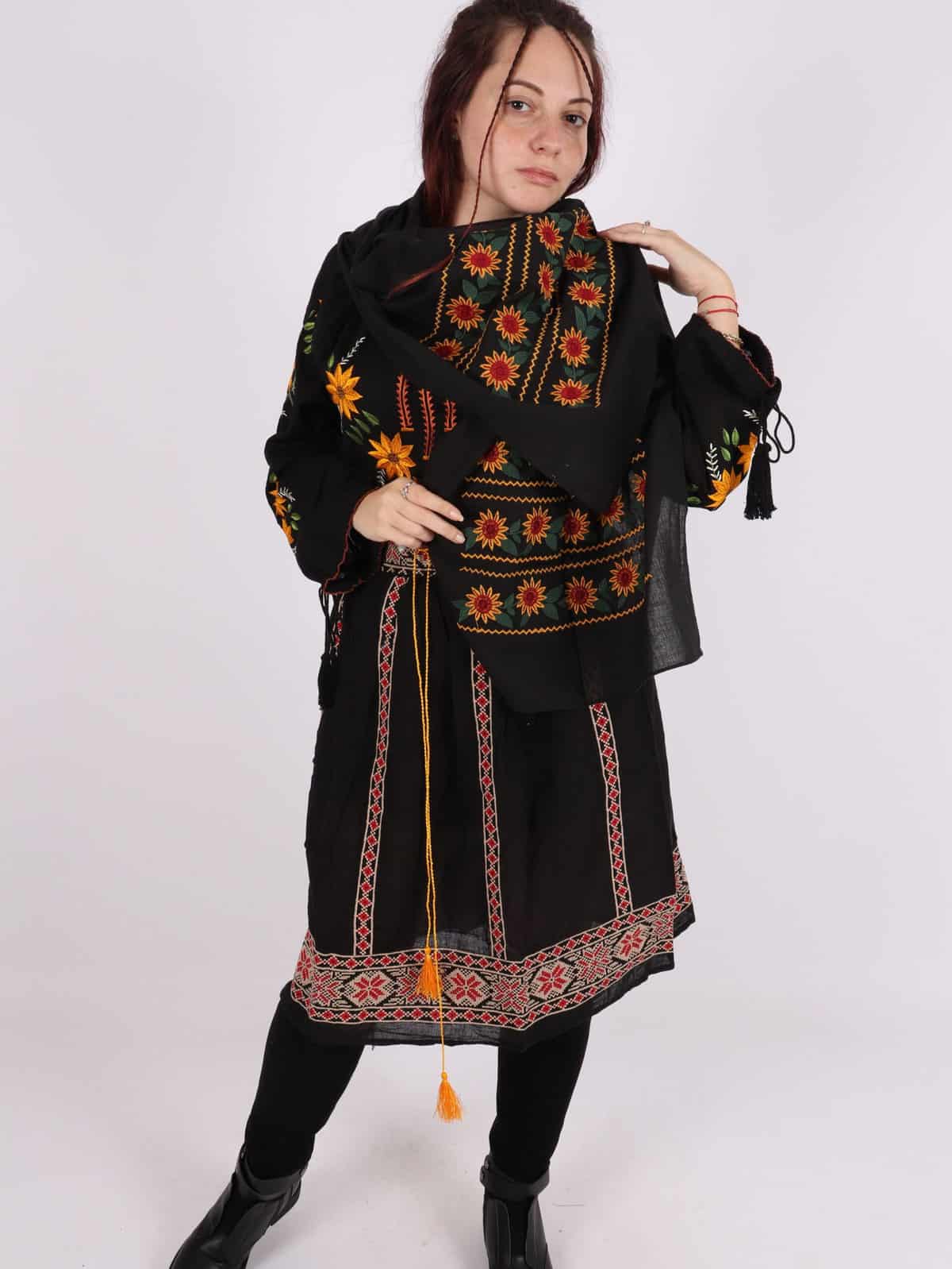 Marama traditionala de dama cu broderie. 100% bumbac. Aceasta poate fi purtata in diferite feluri, ca si esarafa, batic sau sal. ! Se recomanda spalare la masina la 30 grade, de preferat spalare manuala. ! Nu iese culoarea din broderie, materialul nu intra la apa!